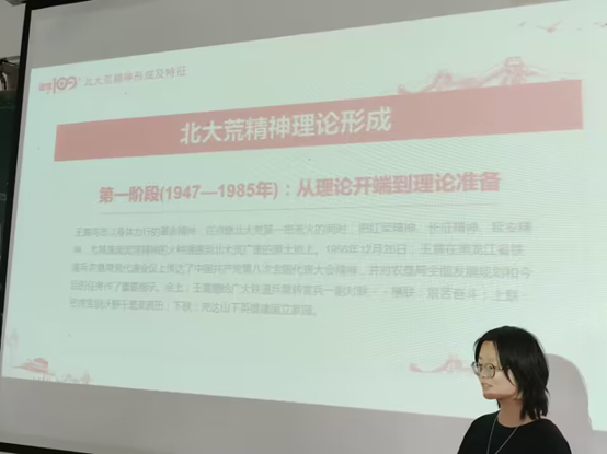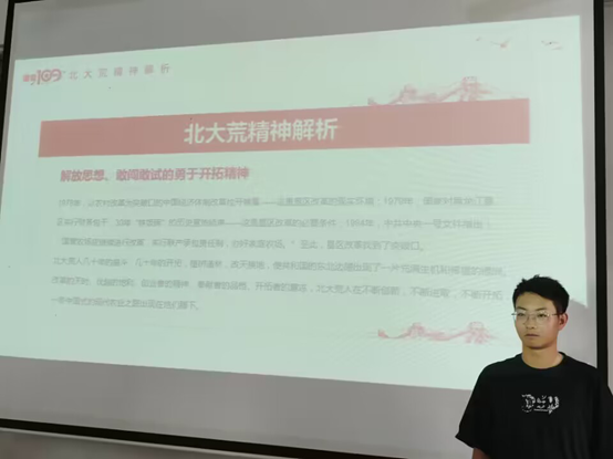 22级农机1班郝超乙通过不畏艰险顽强拼搏的艰苦奋斗精神、解放思想敢闯新路的勇于开拓精神、胸怀全局富国强民的顾全大局精神、不计得失勇于牺牲的无私奉献精神四个方面,向广大学生展现了20世纪50年代初我国十万转业官兵在东北三江平原的亘古荒原上发起的伟大壮举。